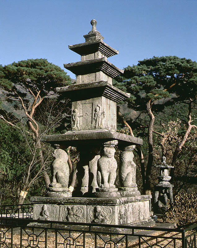오른쪽 작은 탑은 구례 화엄사 원통전 앞 사자탑 이것도 보물이다. 각황전과 영산전 사잇길로 오르면 또 하나의 불후의 명작을 만난다. 효대라 불리는 곳의 4사자삼층석탑이다. 화엄사를 상징하는 건물이 각황전이라면 화엄사를 대표하는 유물은 4사자삼층석탑이라 할 수 있다. 사자 네 마리가 탑을 머리에 이고 있는데, 탑은 부처를 상징하므로 부처가 사자좌에 앉았음을 뜻한다. 4사자삼층석탑은 한 단계 진보한 명작이라 하겠다.