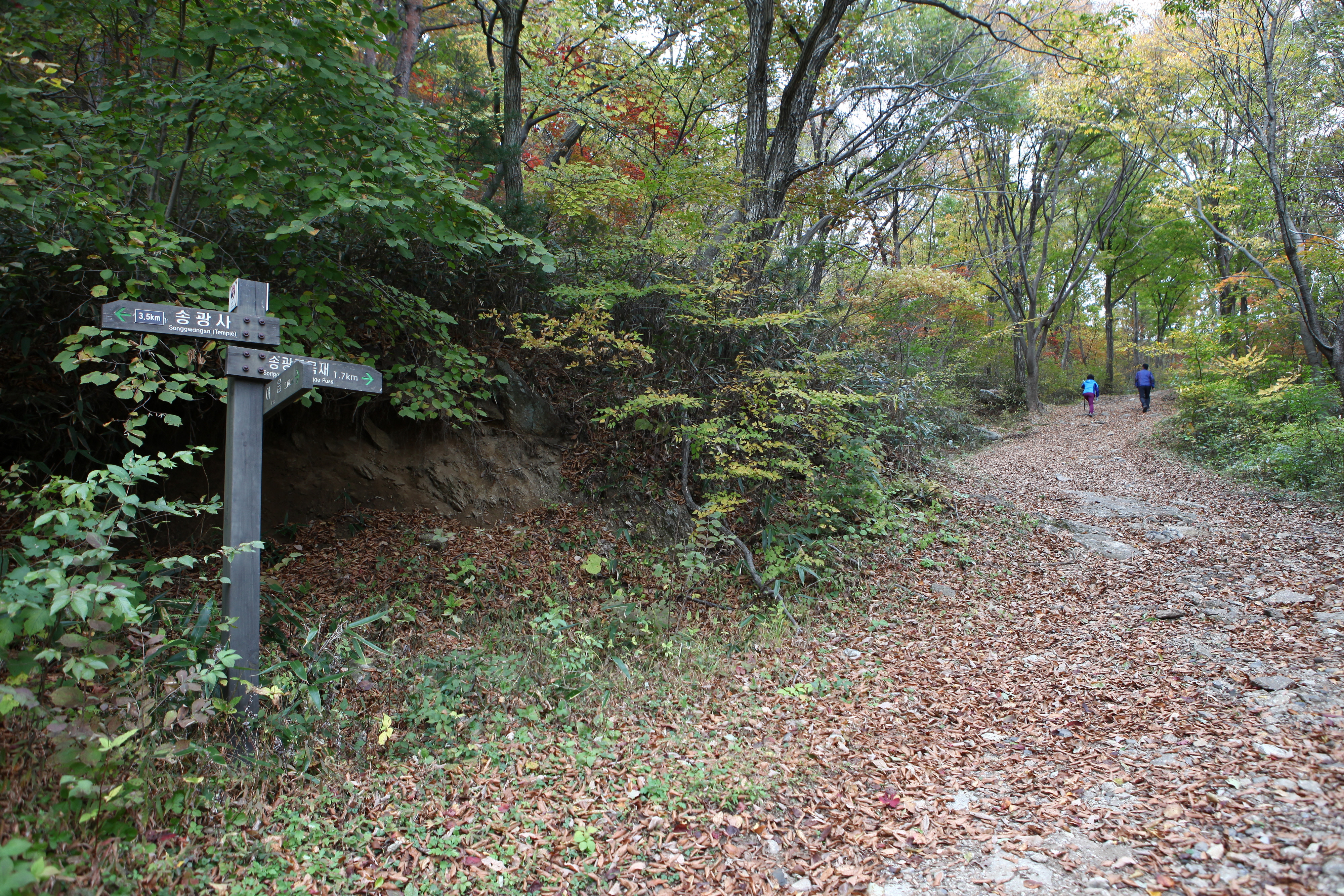 여기부터 본격적인 트레킹이 시작된다. 진득한 오르막, 단풍나무, 서어나무, 층층나무 수종이 다채롭다. 계곡은 이내 끊기고 낙엽 풍성한 고개를 오른다. 서걱서걱 낙엽 밟는 소리만이 정적을 깨운다. 역시 비고 400미터는 만만치 않다. 그 끝에는 선암굴목재, 일명 큰 굴목재가 있었다.