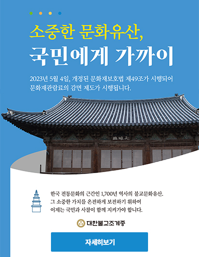 대한불교조계종(총무원장 진우스님)은 문화재보호법 개정에 따른 문화재관람료 감면 시행을 위하여 정부와 협의를 마치고 오는 5월 4일부터 국가지정문화재를 보유한 관람료 사찰 65개소에 대한 문화재관람료 감면을 시행하였습니다.
