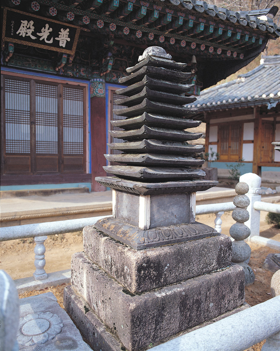 땅과 맞닿아 탑의 토대가 되는 바닥돌은 화강암을 이용하여 3단으로 쌓았으며, 그 위에 탑신을 받치는 기단(基壇)과 지붕돌은 점판암으로 구성하였다. 기단은 1단으로 밑면에는 돌아가며 연꽃무늬를 장식하였고, 윗면은 네 모서리에 대리석 돌기둥을 세웠으며, 맨윗돌에는 연꽃무늬를 새겼다. 탑신의 몸돌은 남아있지 않고 지붕돌만 10층이 쌓여 있다. 지붕돌은 경사진 4면이 매우 평평하고 얇으며 밑면엔 낮은 3단의 받침이 새겨져 있고 처마는 네 귀퉁이에 이르러 위로 살짝 들려 올라갔다. 청석탑은 대체로 고려시대에 본격적으로 유행하게 되지만 이 석탑은 신라 말에 만들어져 청석탑의 선구라 할 수 있다. 석등은 탑의 옆에 있으며, 탑과 거의 동일한 시대의 작품이다.
