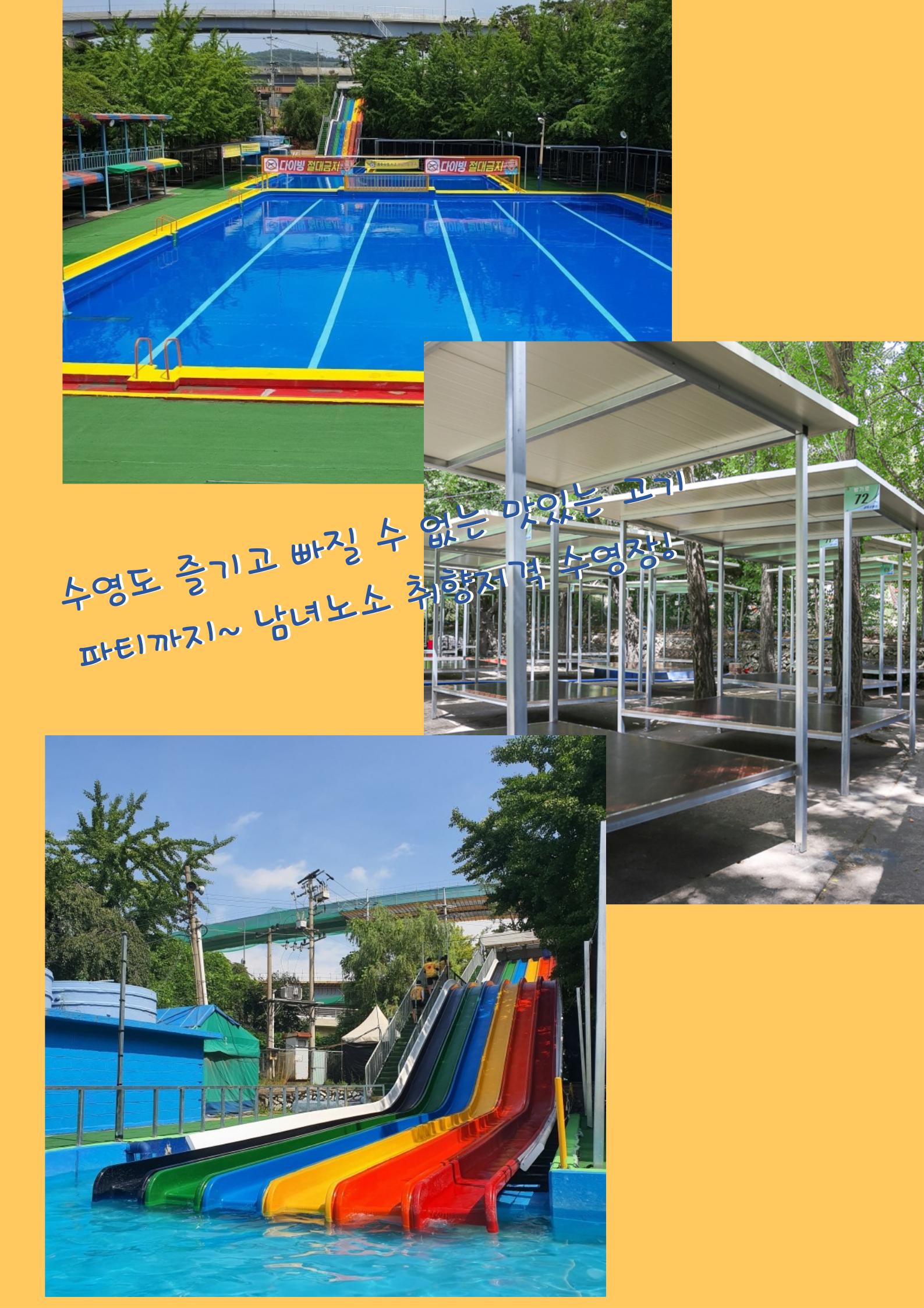 수심 1.1m의 메인풀과 총 4대의 슬라이드, 유아풀과 유수풀까지 작은 워터파크를 즐길 수 있는 배다골테마파크 내 수영장입니다. 평일에는 워터바이크과 카약 등 수상레저가 무료로 운영되며 평상 또한 무료로 대여할 수 있습니다.