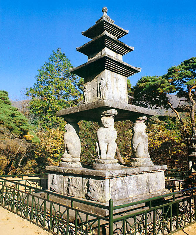 탑신은 1층 몸돌에 문짝 모양을 본떠 새기고, 양 옆으로 인왕상(仁王像), 사천왕상(四天王像), 보살상을 조각해 두었다. 평평한 경사를 보이고 있는 지붕돌은 밑면에 5단씩의 받침이 있으며, 처마는 네 귀퉁이에서 살짝 들려 있다. 탑의 꼭대기에는 머리장식의 받침돌인 노반(露盤)과 복발(覆鉢:엎어놓은 그릇모양의 장식)만이 남아있다. 각 부분의 조각이 뛰어나며, 지붕돌에서 경쾌한 아름다움을 보여주고 있어 통일신라 전성기인 8세기 중엽에 만들었을 것으로 추측된다. 특히 위층 기단의 사자조각은 탑 구성의 한 역할을 하고 있어 국보 경주 불국사 다보탑과 더불어 우리나라 이형(異形)석탑의 쌍벽을 이루고 있다.