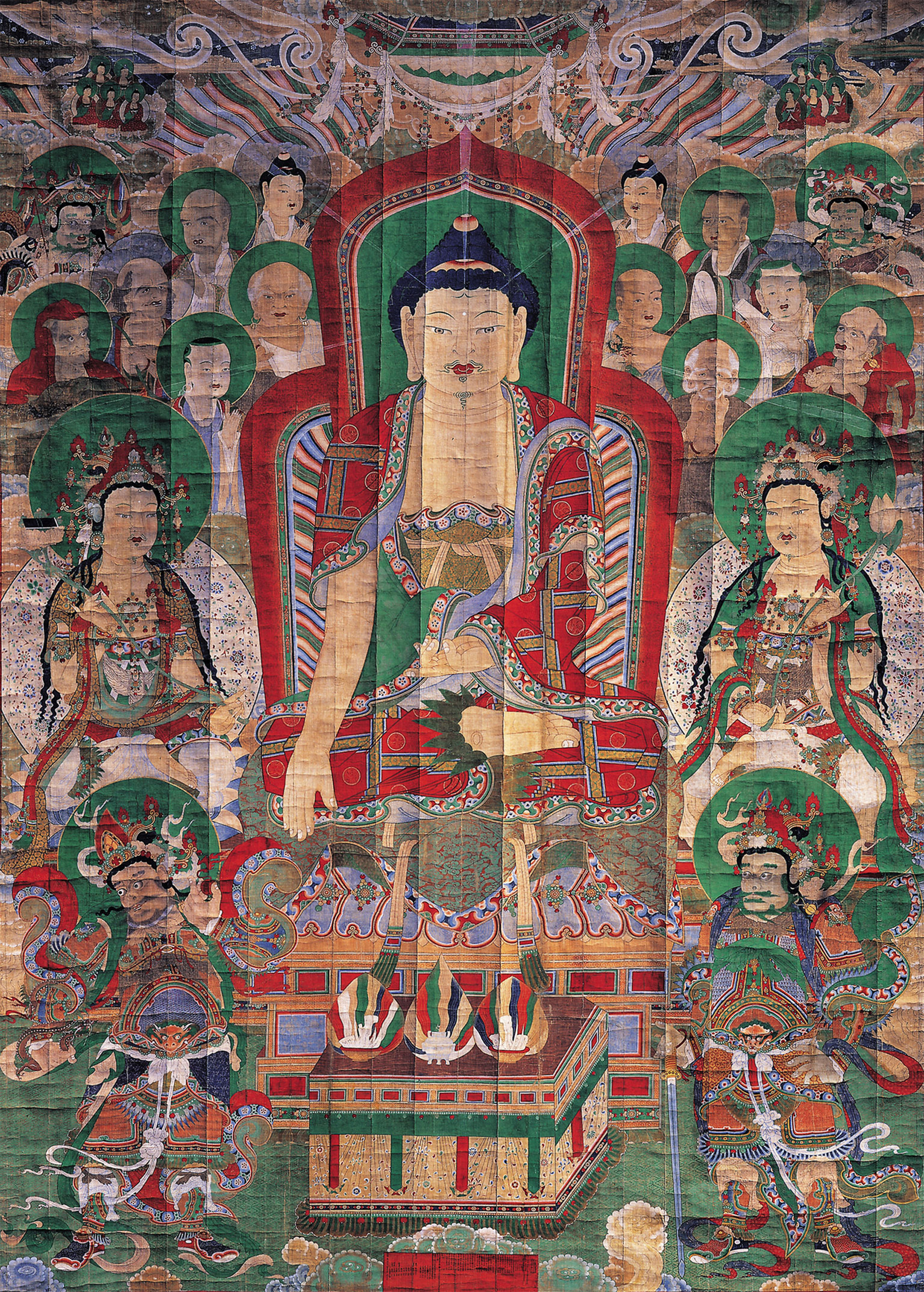 석가불 좌우로 문수보살과 보현보살이 석가를 모시며 서 있다. 사천왕 중 2구는 그림의 하단에, 2구는 상단에 배치해 마치 네 모서리를 지키는 것처럼 보인다. 각 상들의 얼굴은 둥글고 커다란 눈에 작은 코와 입, 길다란 귀를 가지고 균형잡힌 모습으로 서 있다. 홍색과 녹색을 주로 사용하였고 중간색을 사용해 은은하면서도 밝은 느낌을 주며 채색무늬와 금색무늬가 화려함을 더하고 있다.
