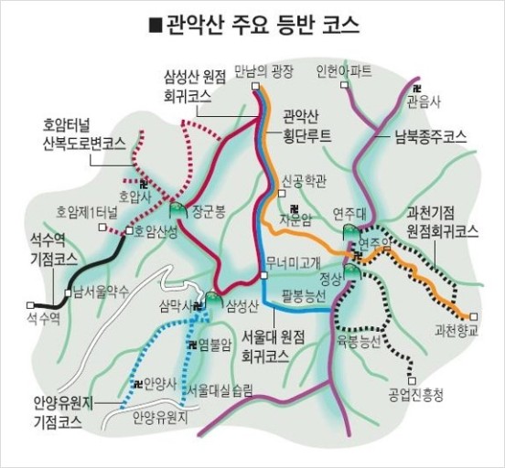 인구 밀집지역 가운데에 위치한 산이라 주말에는 등산객이 매우 많기 때문에 공식 등산로 이외에도 여러 등산로들이 개척되어 있다. 크게 서울시, 과천시, 안양시 방면에서 올라오는 등산로가 있다. 여기에서는 대중적인 대표 등산코스만 소개합니다.