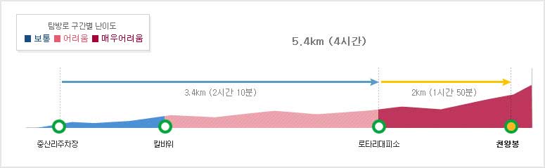 ※참고로 중산리(칼바위)코스는 지리산의 가장 높은 봉우리인 천왕봉을 가장 단시간에 오를 수 있는 최단코스이며 당일 산행으로 천왕봉을 오를 수 있는 대표 탐방코스임