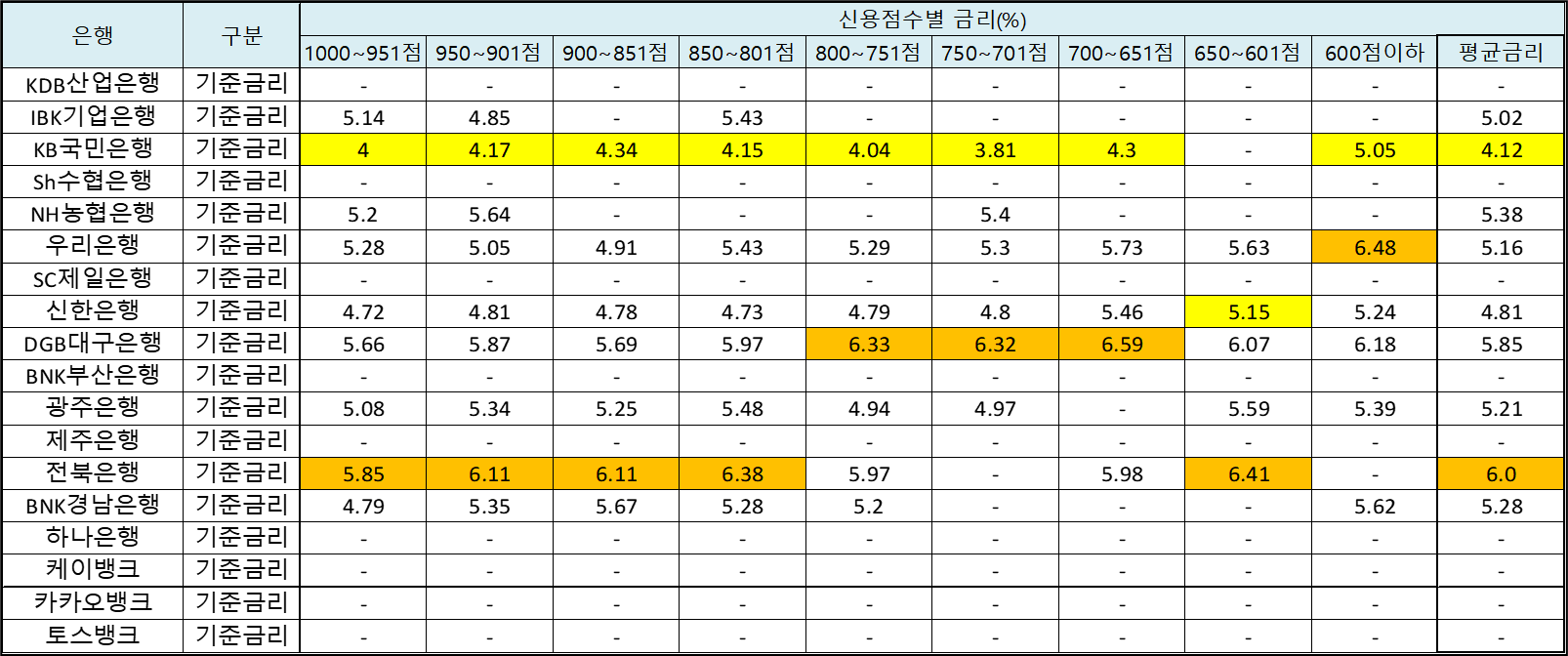 -가계대출 은행별 신용구간별 금리 현황은 아래 표를 참조하시기 바랍니다.