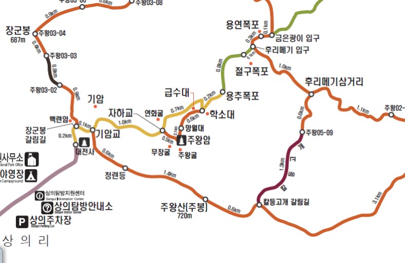 절구폭포~상의주차장 탐방로 구간은 평탄한 흙길 탐방로이며, 약 4.6km구간에 시간은 2시간 5분정도 소요된다. 어린이, 노약자도 편안하게 탐방할 수 있는 코스로 주왕계곡변을 따라 조성된 탐방로로 이동하게 되며, 운동화로도 탐방이 가능하다. 특히 용추폭포~상의주차장구간은 휠체어와 유모차로도 이동이 가능한 코스로 되어있다.