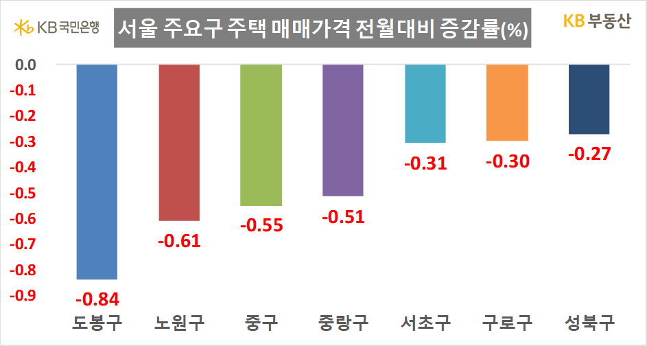 서울 주택 매매가격은 전월 대비 -0.18% 하락했다. 도봉구(-0.84%), 노원구(-0.61%), 중구(-0.55%), 중랑구(-0.51%), 서초구(-0.31%) 등 하락했고 송파구(0.52%), 강남구(0.17%)는 상승했다.