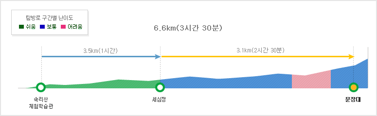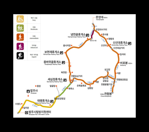 본격적으로 산행이 시작되는 세심정~문장대 구간은 약3.3km구간에 소요시간은 약 2시간30분정도이다. 유모차, 휠체어 탐방은 어려우며, 돌길이 어렵지 않아 운동화로도 탐방이 가능하다. 전체적으로 난이도가 높지는 않으나 오리숲 탐방로를 포함한 탐방코스가 다소 긴 편이기 때문에 체력안배가 중요하다.