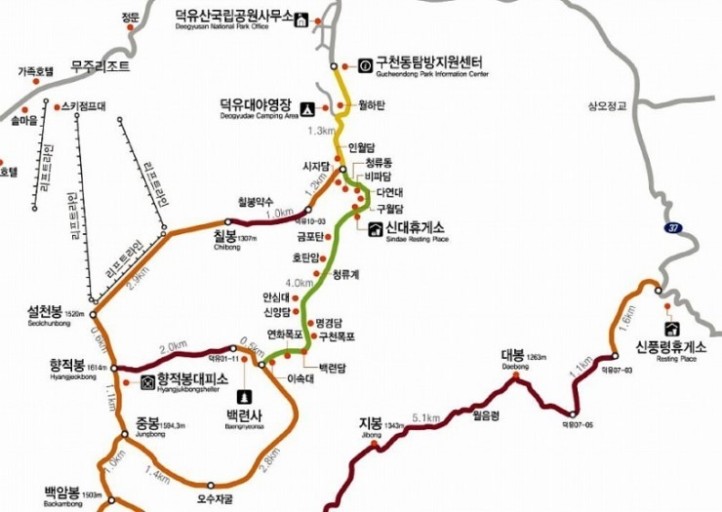 구천동탐방지원센터에서 구천동 33경을 따라 향적봉까지 이어지는 탐방코스(편도 8.5km, 3시간)
