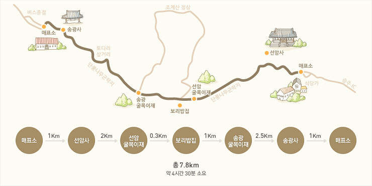 동서횡단(천년불심길) 코스 : 송광사~송광사굴목재~선암사굴목재(큰굴목재)~선암사로 이어지는 동서 횡단로는 정상과 주능선을 거치지 않는 산길이지만 양대 사찰답사와 숲길 산행에 이어 산중 주막에서 봄향기 가득 담은 보리밥 먹는 즐거움이 더해지는 코스다.