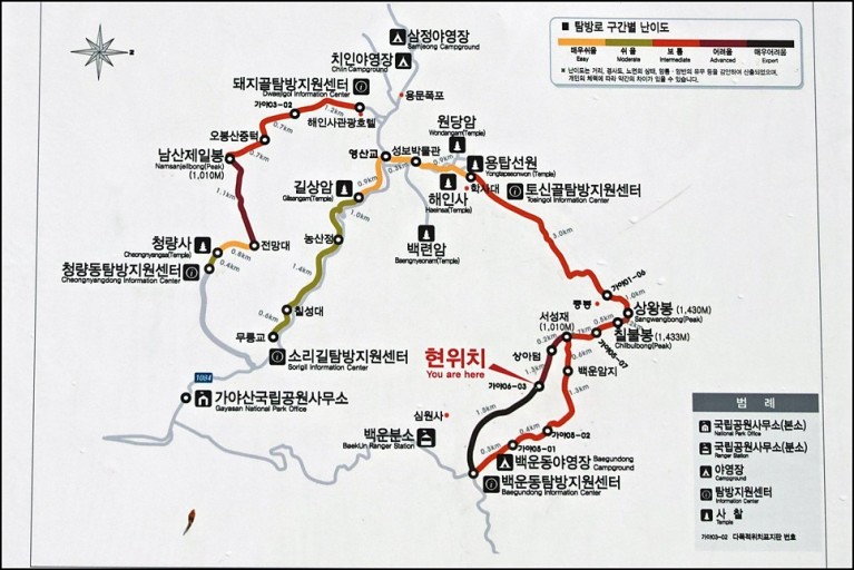 가야산 1코스는 가야산 정상을 향하는 첫 번째 탐방로이며 산행을 통한 신체 건강뿐만 아니라 해인사 범종소리, 팔만대장경 등 소중한 문화유산을 탐방하면서 정신 건강까지 이롭게 할 수 있는 탐방로