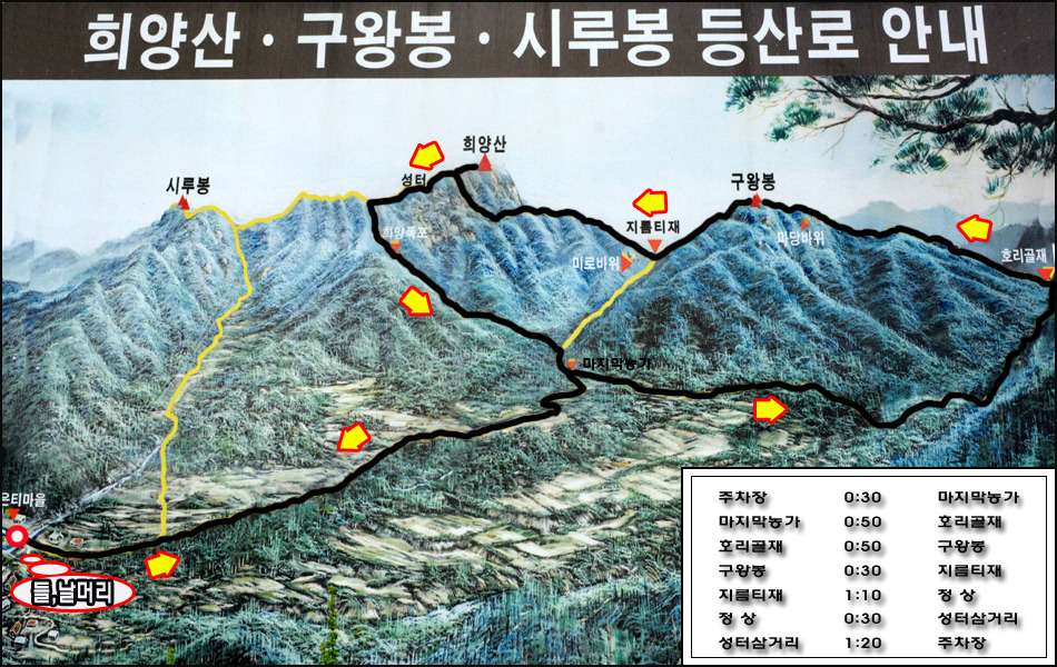 1코스 : 갈림길~지름티재~미로바위~정상~성터~희양폭포~갈림길~은티마을(소요시간 3시간)