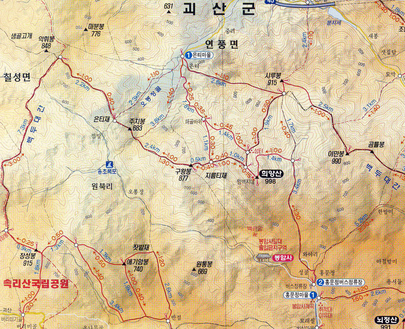 2코스 : 갈림길~호리골재~마당바위~구왕봉~지름티재~미로바위~정상~성터~희양폭포~은티마을(4시간 30분)
