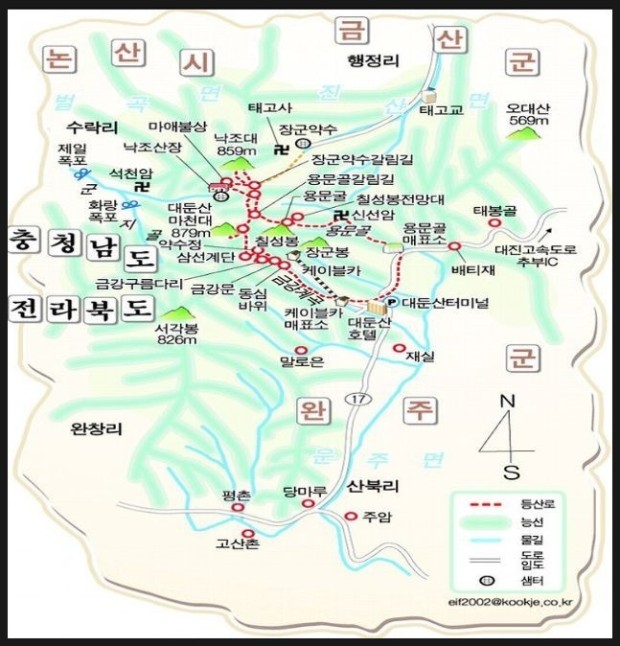 반면에 논산(북) 쪽은 협곡을 거느린 깊은 숲을 이뤄 완주 쪽보다 수량이 풍부하고 폭포가 장관을 이룬다. 군지골의 제1폭포와 화랑폭포, 금강폭포는 그 앞에서 단 10분도 견디지 못할 정도로 피서지로는 제일이다.