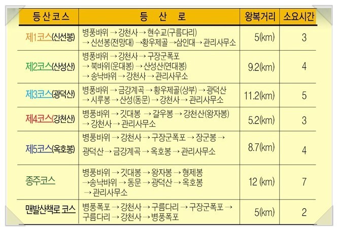 가장 인기 있는 1코스와 2코스를 연계하여 현수교를 왕복한 다음 강천사계곡을 따라 구장군폭포~선녀계곡~산성산~운대봉~북바위~동문~선녀계곡~강천사~매표사를 잇는 원점회귀 산행이 등산인들에게 가장 인기 있는 코스이고 약 4시간 소요된다.