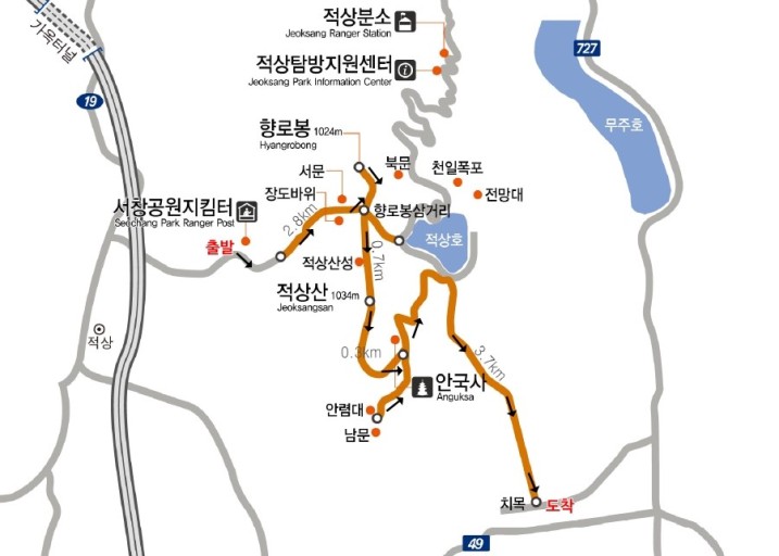 서창공원지킴터에서 시작하여 향로봉과 안국사로 향하는 탐방코스(편도 3.8km, 2시간)