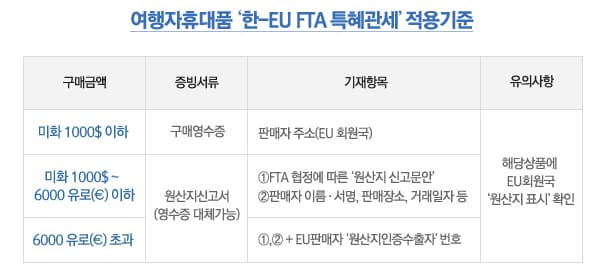 유럽 여행 시 명품에 대한 관세를 면제받기 위해서는 EU회원국에서 만들어진 제품이라는 사실을 입증할 수 있는 '원산지 신고서'를 반드시 준비해야합니다. 원산지 증명을 중요시하는 FTA의 특성에 따른 것입니다.