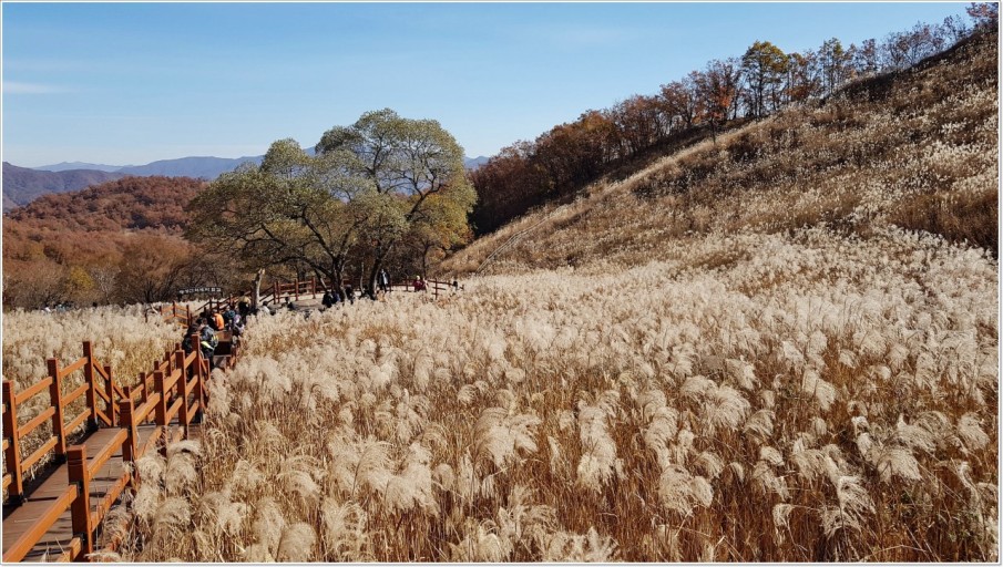 명성산의 명성名聲을 드높여 주고 있는 억새군락지는 총사업비 10억 원이라는 예산으로 억새밭을 가로 질러 팔각정으로 연결되는 데크로드를 비롯해 포토존과 전망대와 쉼터 등을 조성했다. 그래서 억새 군락지에서는 등산화에 흙 하나 묻히지 않고 콧노래 부르며 팔각정까지 쉽게 오르고 내릴 수 있다.