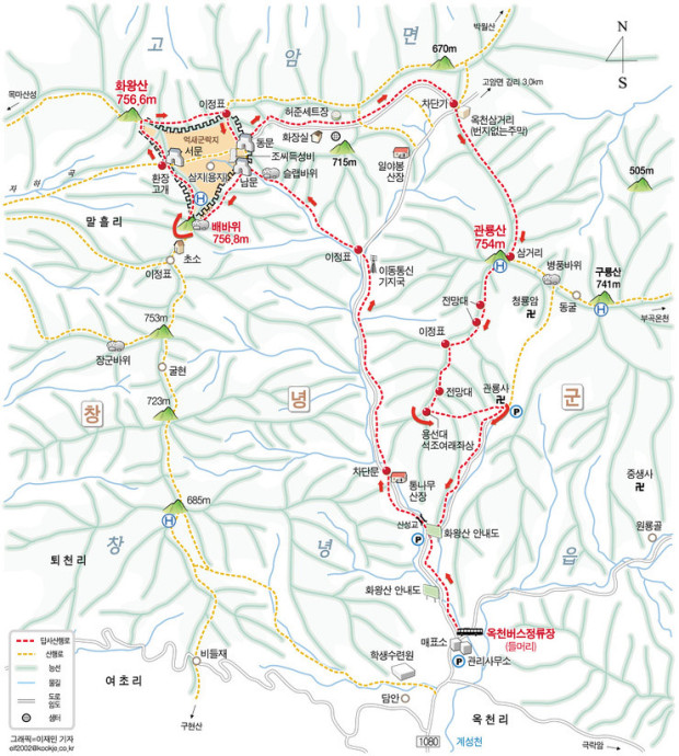 화왕산의 여러 코스 중에서 산행엔 자하골 코스(자하골 매표소~화왕산장~전망대~암릉~배바위~남문~동문~정상~서문)나 옥천 매표소-임도 코스(옥천 매표소~임도~동문~남문~배바위~서문~정상~서문)가 제일 무난하다. 두 코스 중에서도 비교적 사람들이 덜 몰리는 곳은 옥천 매표소-임도 코스다. 두 코스 모두 3시간 정도면 넉넉하다.