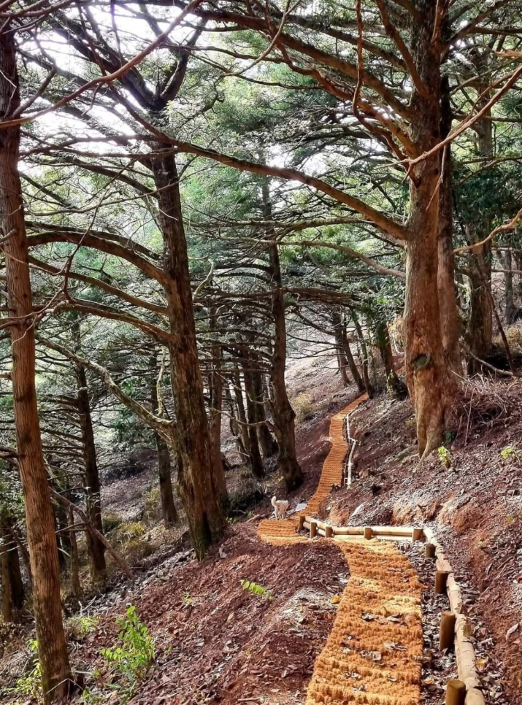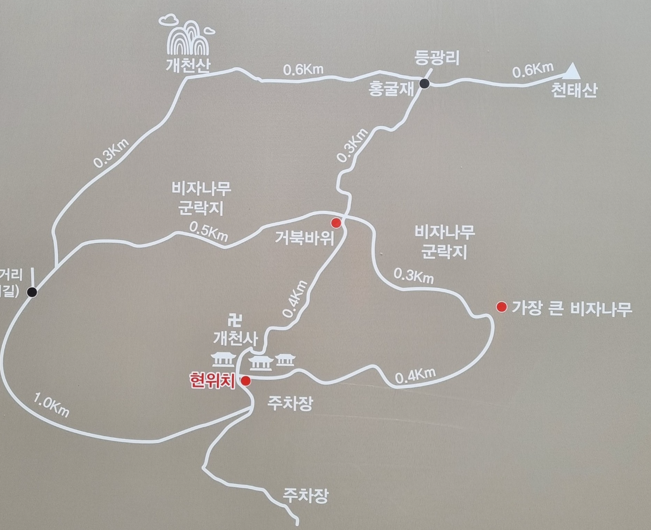 대웅전 왼쪽으로 등산로 이정표가 있다. 돌계단을 올라서 물탱크를 지나면 곧장 비자나무숲으로 연결된다. 이정표는 '개천산 0.9㎞'를 가리킨다. 마른 계곡 주변에는 고목 수준의 아름드리 비자나무들이 울창하다.