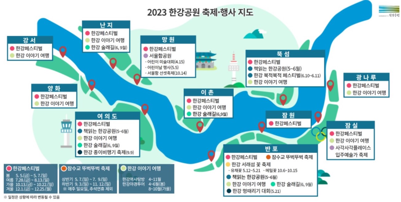 봄 '온갖 즐거움이 모이는 한강'이라는 주제로 한강 수상과 11개 한강 공원 전력에서 매력이 가득한 프로그램이 펼쳐질